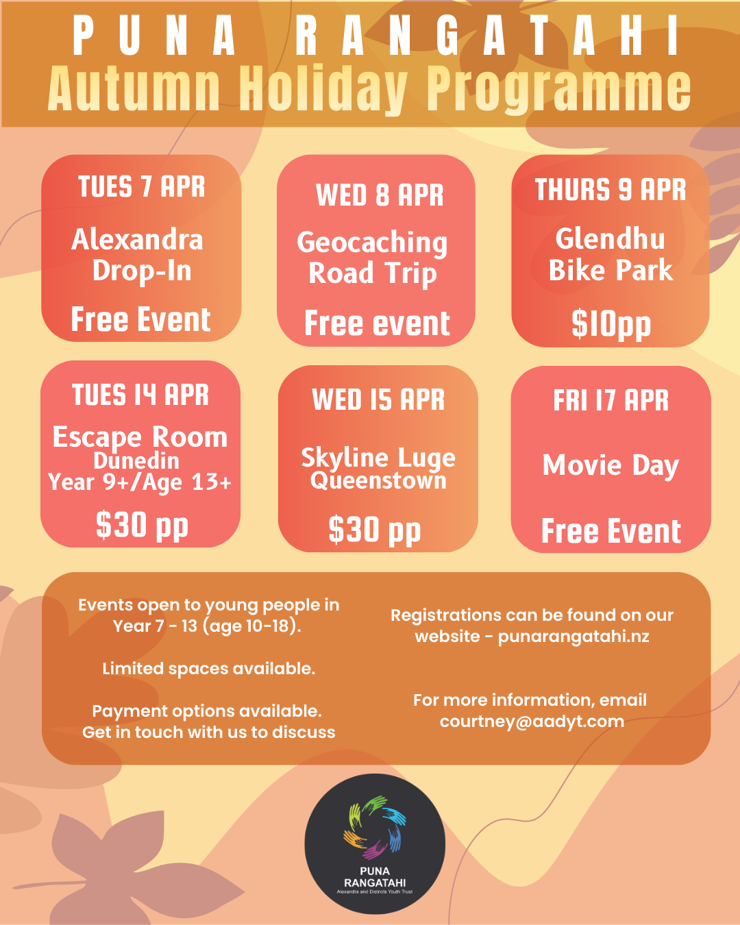 We offer events during the school holidays! These events are open to rangatahi in Year 7 to 13 (age 10-18)